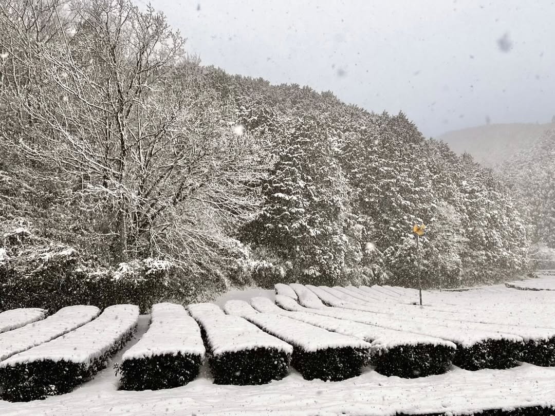 実はこの時期の雪は、お茶にとっては「恵みの雪」なんです。サラっと積もる雪は、茶樹を極端な冷え込み(放射冷却)から守る断熱材の役割を果たして、乾燥からも守ってくれます。